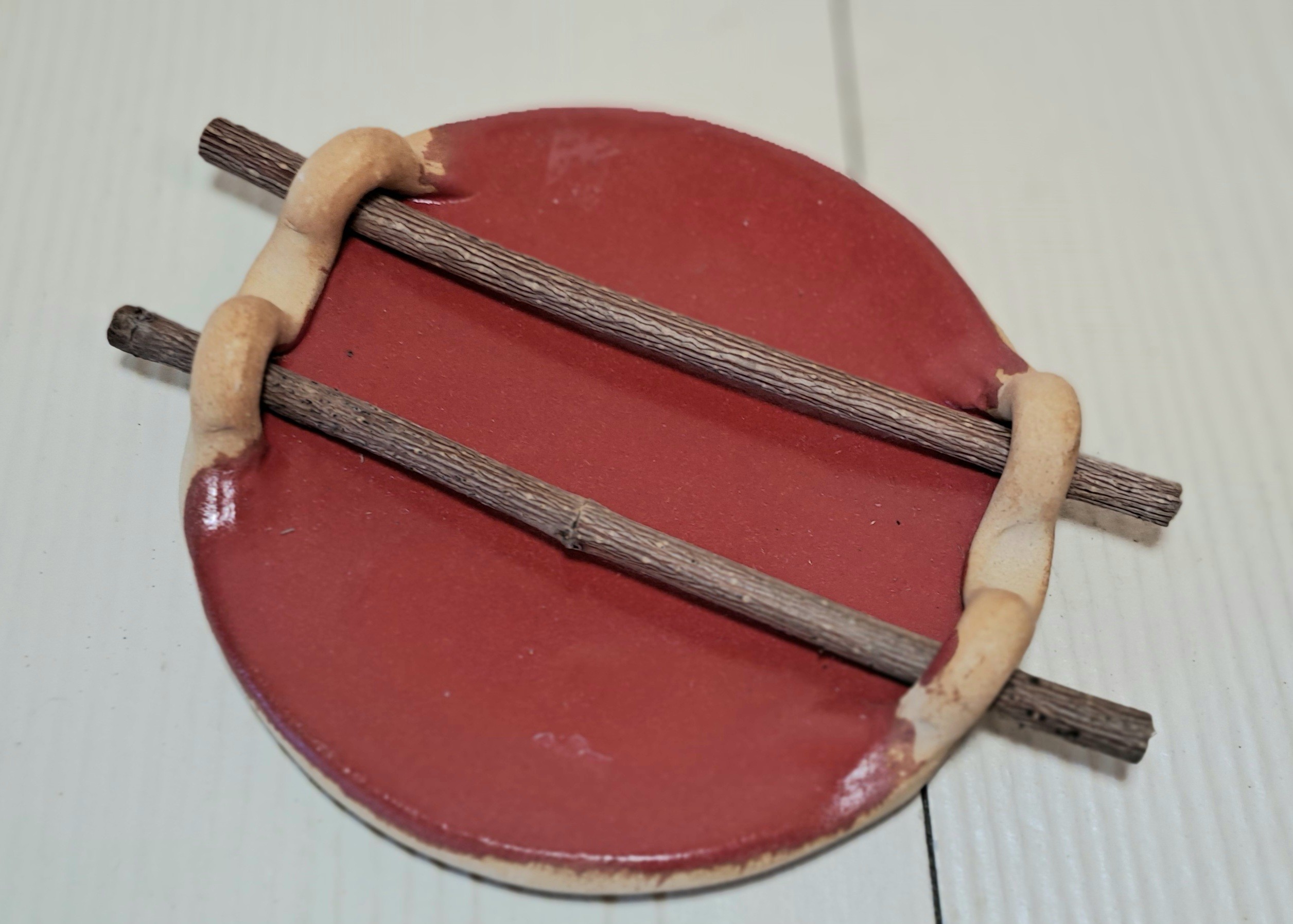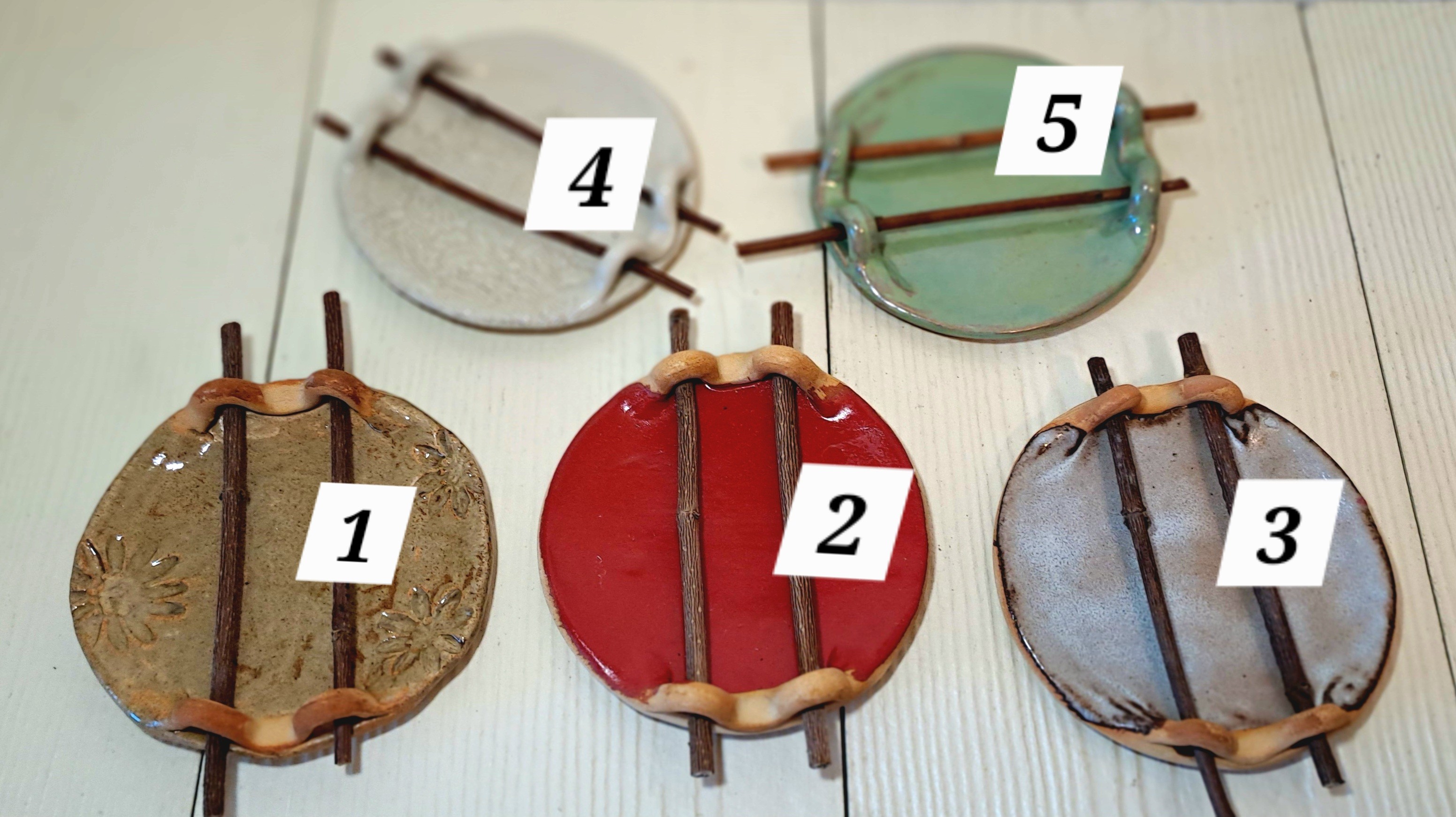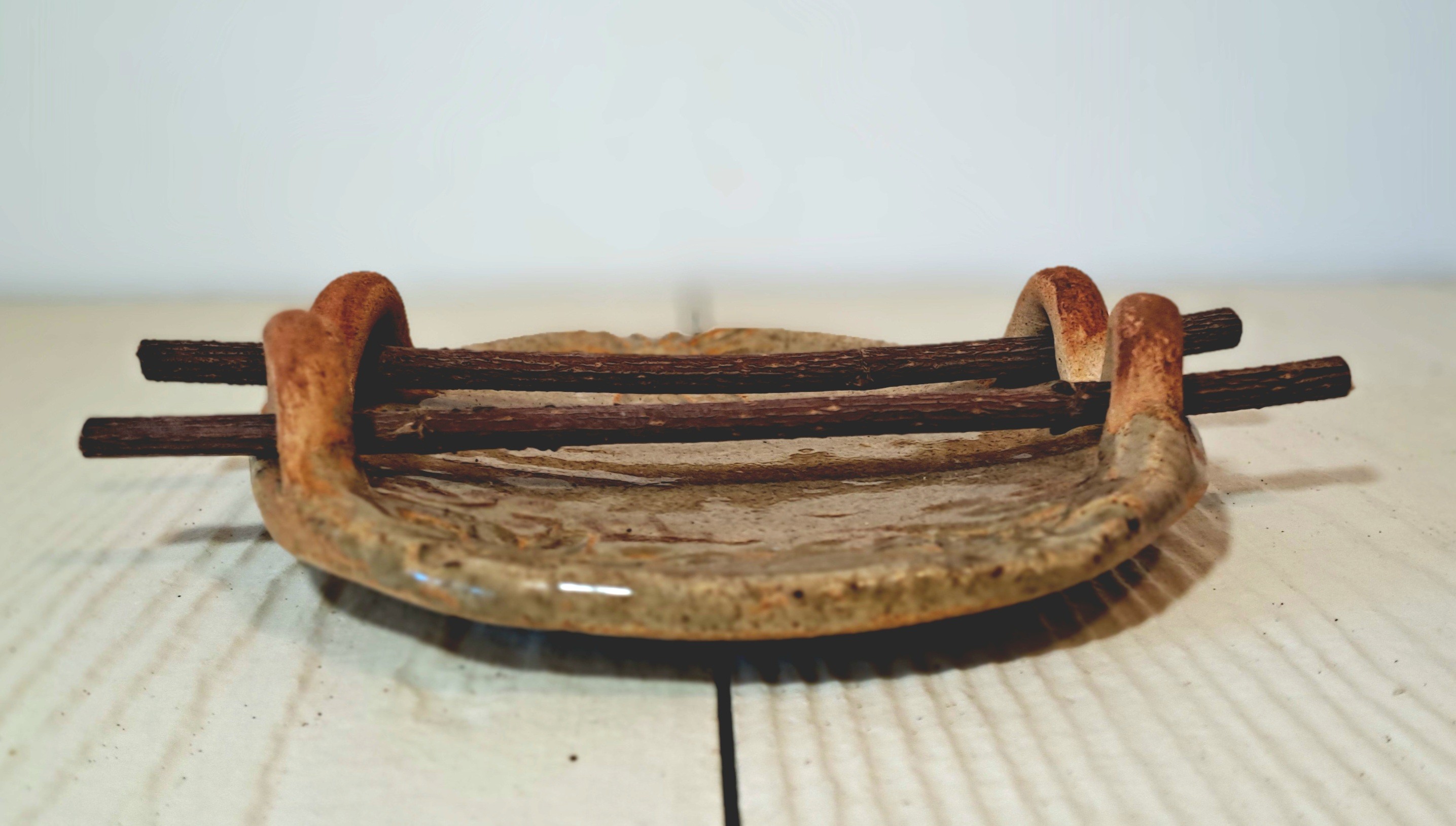 Porte-savon en céramique, terre et bois.