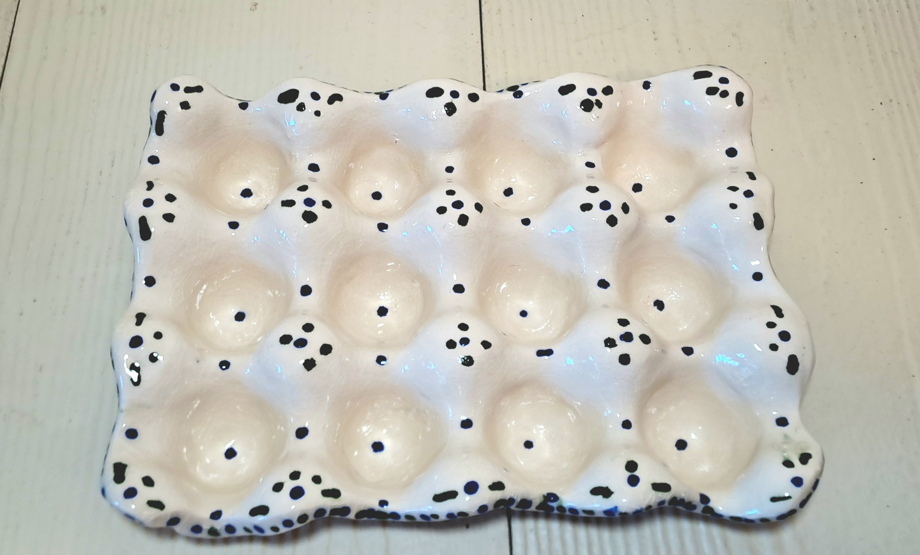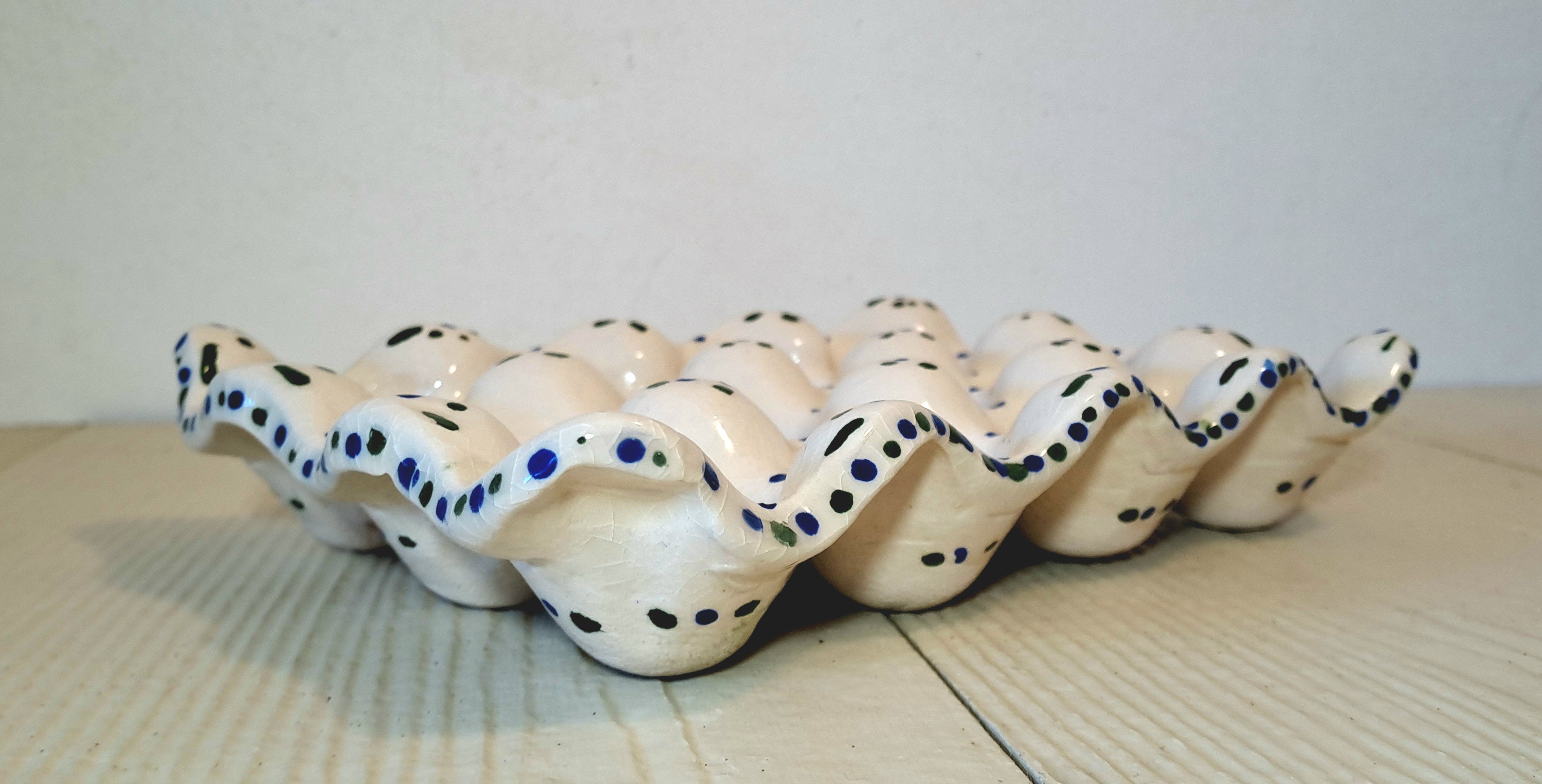 Boîte à oeufs / support à oeufs en céramique, blanc avec points verts et bleus.