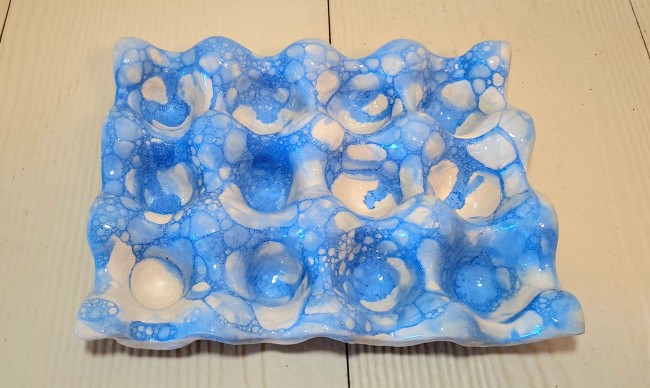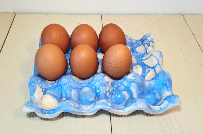 Boîte à oeufs / support à oeufs en céramique, blanc et bulles bleues.