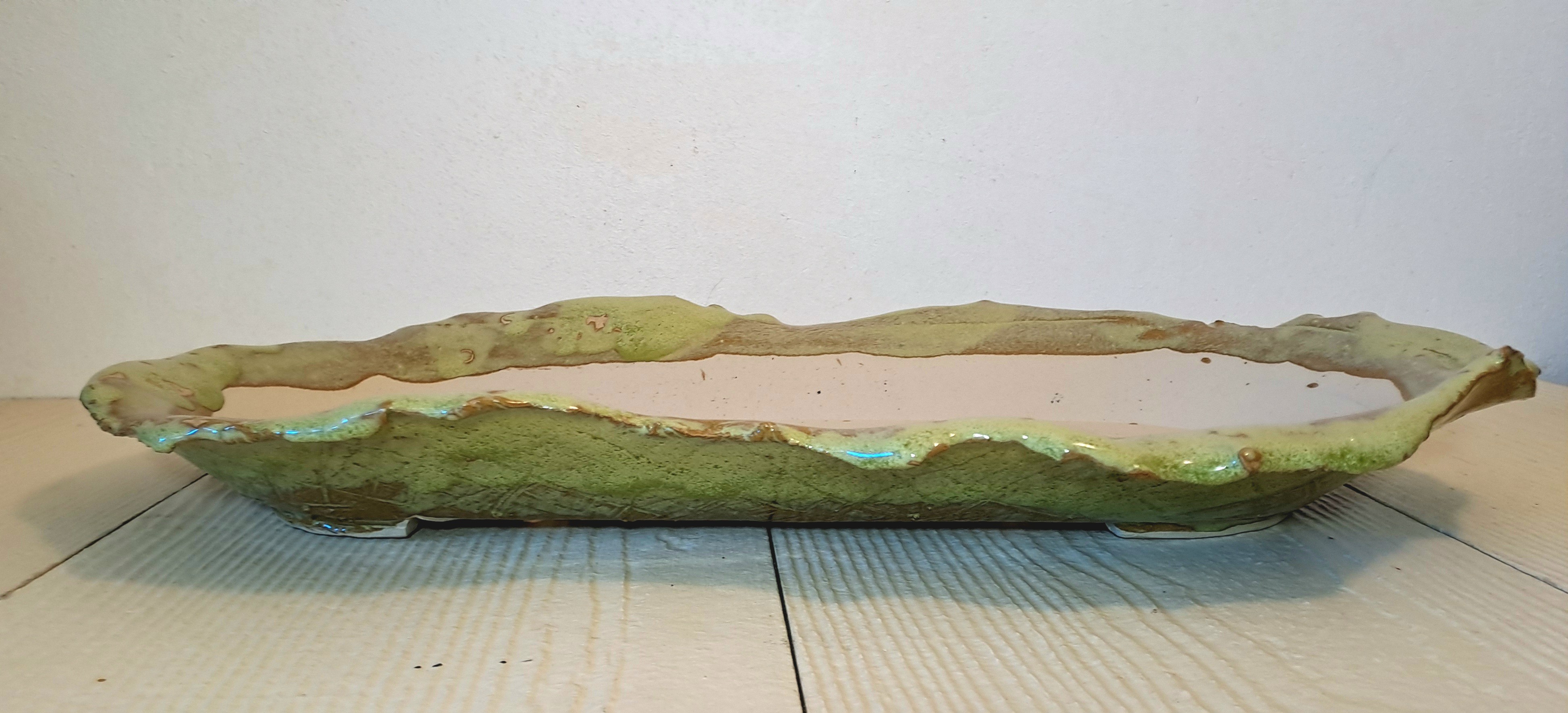 Apportez une touche d’élégance naturelle à vos compositions avec ce pot à bonsaï artisanal en grès vert. Sa forme allongée en fait un support parfait pour la création de petites forêts de bonsaï ou de paysages miniatures.